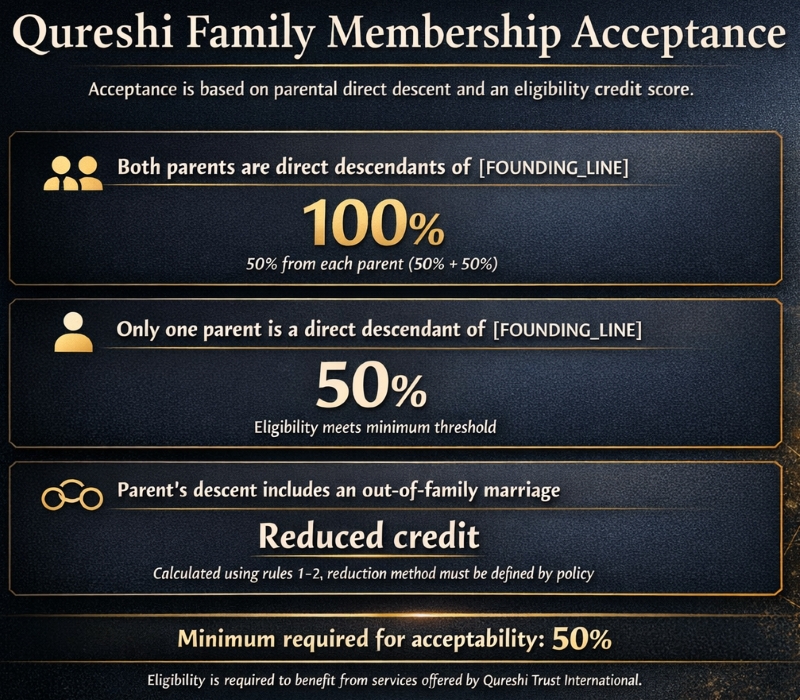 The basic criteria for acceptance, as a member of the ‘Qureshi Family’, are to have at least one of the parents of the prospective member a direct descendent of the above.